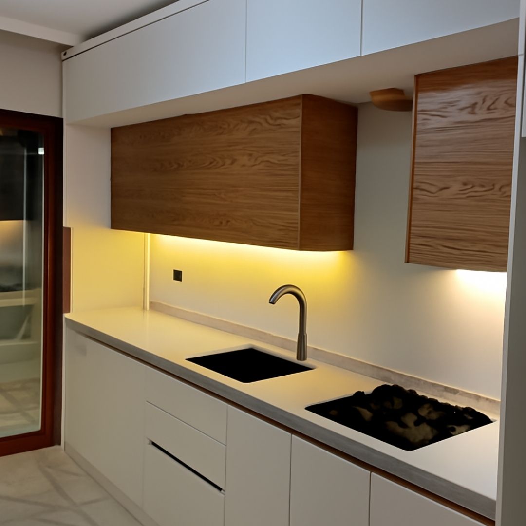 Modern çizgileri doğallıkla buluşturduğumuz bu mutfak tasarımında, fonksiyonelliği ve estetiği bir araya getirdik. Üst dolaplarda sıcak ahşap dokusunu tercih ettik. Alt dolaplarda ise sade ve şık lake yüzeylerle ferahlığı öne çıkardık. Tezgâh altı lavaboyu, gizli LED aydınlatmalarla destekleyerek hem kullanım kolaylığı hem de modern bir ambiyans oluşturduk. Tüm detayları özenle planladık, kullanıcı dostu ve zamansız bir mutfak ortaya çıkardık.