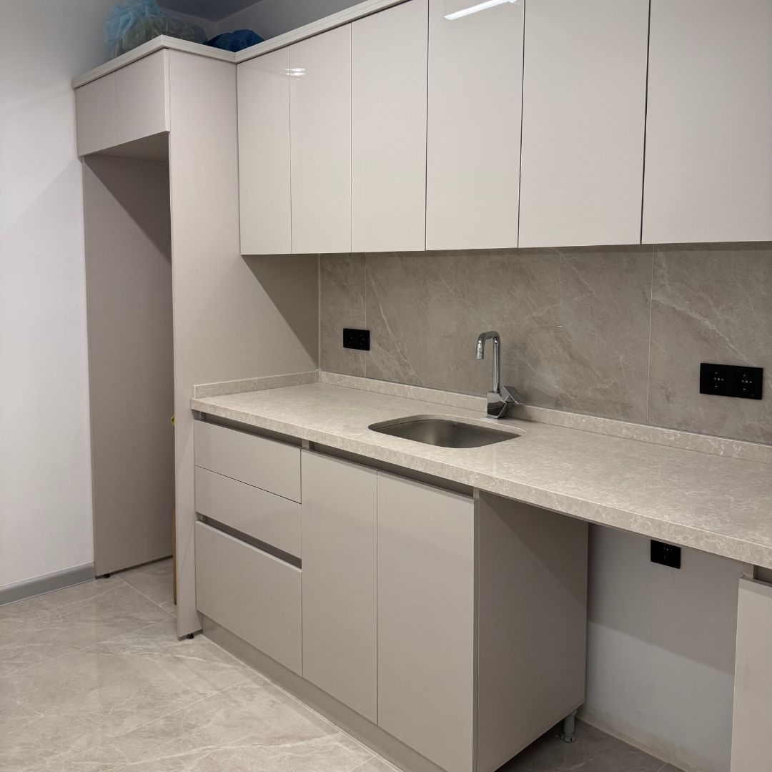 Bu mutfak projemizde, sade şıklığı ve maksimum kullanışlılığı ön planda tuttuk. Çizilmez akrilik parlak yüzeyli kapaklar ve ton-sur-ton renk uyumuyla modern bir görünüm elde ettik. Mermer desenli tezgâh ve arka panel ile sofistike bir dokunuş kazandırdık. Gömme kulpsuz dolaplar sayesinde kesintisiz bir yüzey akışı sağladık ve temizliği kolaylaştırdık. Üst modülleri tavana kadar yükselterek hem estetik bir bütünlük oluşturduk hem de depolama alanını maksimize ettik. Her detayıyla konforlu ve modern bir yaşam alanı tasarladık.
